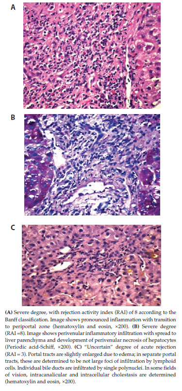 Objectives: At the National Scientific Center of Surgery named A. Syzganova, more than 100 liver transplants have been conducted from 2012 to November 2017. Survival and quality of life of patients in the posttransplant period largely depend on the compliance of patients, monitoring of complications, cause of liver disease, the severity of the condition of patients in the pretransplant period, and the technical features of the operation. The aims of the study were to analyze the results of liver biopsy in patients after liver transplant and to evaluate the value of morphologic studies of the liver for the diagnosis of complications in the posttransplant period.