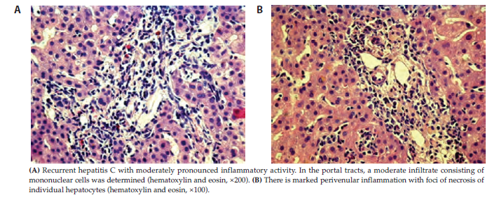 For diagnosis of recurrent HCV (excluding other causes of graft dysfunction), liver biopsies are used to assess disease severity and progression. Histologic abnormalities are often present in protocol biopsies from HCV-positive patients who are clinically healthy, with apparently normal graft function.7 The changes seen in these specimens may have implications for prognosis and treatment.8 For example, the presence and severity of fibrosis at 1 year have been shown to be predictive of subsequent progression to cirrhosis and graft failure.7,9,10 This information may help identify patients who are most likely to benefit from antiviral therapy.11