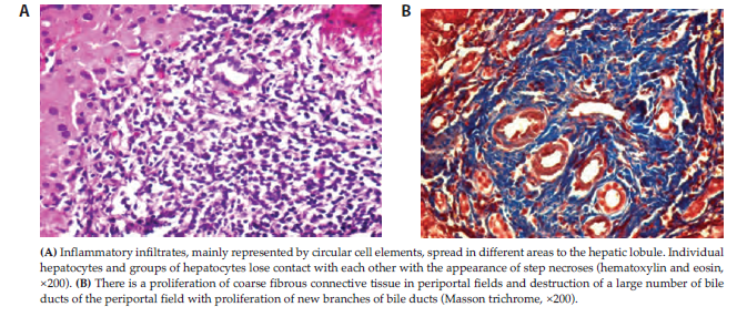 A patient with the recurrent HDV infection received entecavir at 0.5 mg per day. The patient had positive HBsAg, negative results of polymerase chain reaction HBV DNA analysis, and positive results of polymerase chain reaction HDV RNA analysis at 72 weeks after liver transplant. However, 3 months later, results of polymerase chain reaction HDV analysis were negative and results of HBsAg were positive. In the liver tissue (Figure 4), moderate inflammatory infiltrates were seen spreading to the hepatic lobes, forming step necroses. In periportal fields, an increase in the content of connective tissue is visible, with the spread of fibrosis in most portal tracts with single short fibrotic septa.