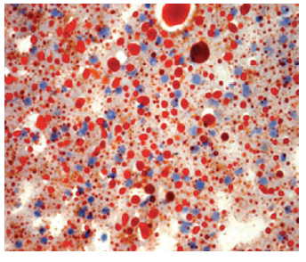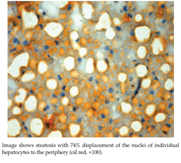 Figure 7. Large-Droplet Steatoses in 52% of Liver Graft of 54-Year-Old Patient 3 Years After Transplant (oil red, ×100)