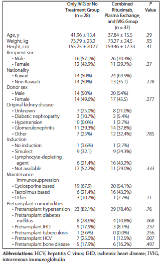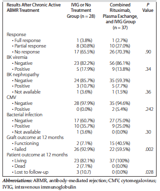 Materials and Methods: In this retrospective study, we compared patients diagnosed with chronic active antibody-mediated rejection who were treated with standard of care steroids, intravenous immuno-globulin, plasma exchange, and rituximab (n = 40) at our center versus those who received intravenous immunoglobulin only or just intensified maintenance immunosuppression (n = 28). All patients were followed for 12 months clinically and by laboratory tests for graft and patient outcomes.