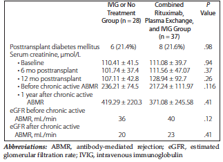 We observed that graft function as represented by eGFR before treatment of chronic active ABMR was comparable in both groups (P > .05), ranging from 39 to 40 mL/min, which was in accordance with results from another study by Stolyarevich and associates17 who reported eGFR around 42 mL/min in their cohort.