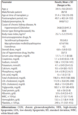 Our study included 46 KTRs. Inclusion criteria were posttransplant period > 3 months and serum creatinine level < 2 mg/dL, without any change in renal function or drug regimen, including immuno-sup-pressive or antihypertensive drugs, for 1 month. Recipients with rejection, acute or overt infections, congestive heart failure, and diabetes mellitus were excluded from the study.