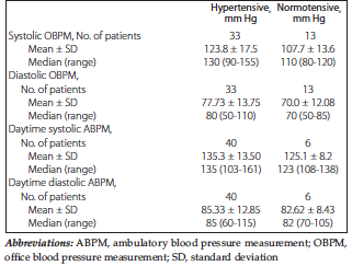 According to the daytime ABPM, 87% (n = 40) of the patients were hypertensive