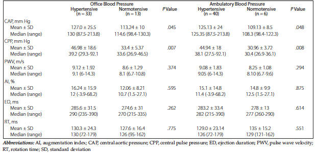 Central aortic blood pressure was found to be significantly higher in patients with hypertension according to OBPM and ABPM (P = .045 and P = .048, respectively). In addition, hypertensive patients, according to OBPM and ABPM, demonstrated higher central pulse pressure than normotensive patients (P = .007 and P = .008, respectively). Other central aortic hemodynamic characteristics, including CAP, pulse-wave velocity (PWV), augmentation index, ejection duration, and rotation time, were similar in hypertensive and normotensive patients as deter-mined by OBPM or ABPM. Pulse wave velocity was not significantly higher in hypertensive versus normotensive patients (Table 4).
