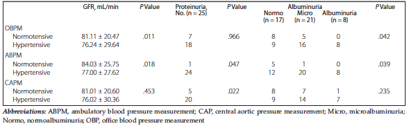 Patients who were hypertensive according to ABPM had lower GFR than normotensive patients (P = .018) and also higher incidences of microalbu-minuria and proteinuria (P = .047 and P = .039, respectively).