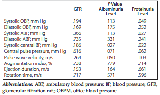 Table 6. Relationships Between Blood Pressure Levels and Central Hemodynamic Characteristics, Glomerular Filtration Rate, and Proteinuria and Albuminuria Levels