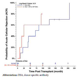 Figure 3. Acute Cellular (T-Cell Mediated) Rejection Was Not Observed Significantly Earlier After Liver Transplant in Patients With DQ + DR ± DP Donor-Specific Antibodies Compared With Patients With DQ Donor-Specific Antibodies (P = .31)