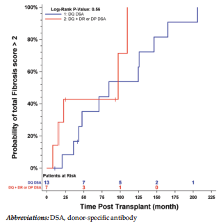 Figure 4. Development of Average Total Portal Fibrosis Score > 2 Was Not Observed Significantly Earlier After Liver Transplant in Patients With DQ + DR ± DP Donor-Specific Antibodies Compared With Patients With DQ Donor- Specific Antibodies (P = .56)
