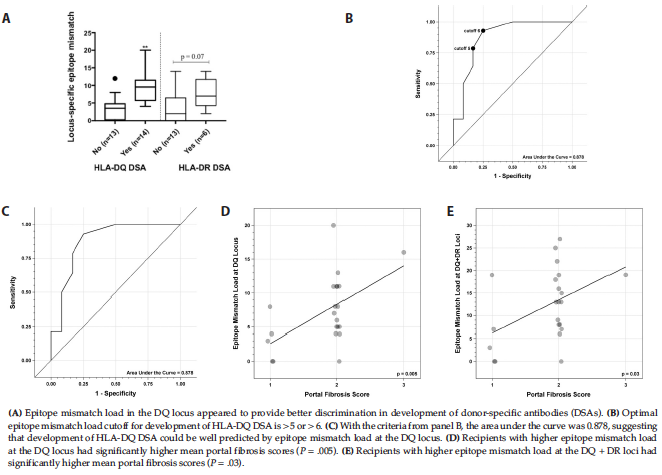 Results: In our group of 42 recipients, 20 (48%) had donor-specific antibodies. Having an antibody against HLA-DQB1*02 was associated with acute rejection (66.6% vs 36%; P = .024). We found that DQ epitope mismatch load was greater in recipients with class II donor-specific antibodies (9.7 vs 3.6; P = .001). HLA-DQ (7.4 vs 3.6; P = .04) and HLA-DR (8.8 vs 3.8; P = .04) epitope mismatch loads were higher in recipients with DQ + DR donor-specific antibodies. A high portal fibrosis score was associated with higher mismatch load at the DQ locus (P = .005) and DQ + DR loci (P = .03). Having > 5 or > 6 epitope mismatch loads at the DQ locus identified a threshold above which development of DQ donor-specific antibodies would occur (area under the curve = 0.878). Mismatches for eplet 4Q, 45GE, 52PQ, and 52PL, thought to be immunodominant epitopes, were observed for several recipients.
