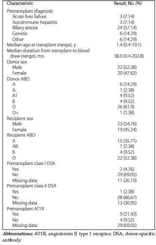 Pediatric patients on wait lists for transplant undergo HLA typing, and their sera are stored for subsequent measurements of anti-HLA DSA and AT1R. After liver transplant, anti-HLA DSA, serum IgG, and autoantibodies (antinuclear antibody, anti-smooth muscle antibody, anti-soluble liver antigen, anti-liver kidney microsomal antibody) are measured as part of evaluation of liver allograft dysfunction and when a protocol liver biopsy is performed. Protocol liver biopsies are performed at ≥ 5 years after liver transplant. Measurements of anti-HLA and non-HLA antibodies are performed at time of liver biopsy. If a patient had more than 1 liver biopsy within our study period, only the first liver biopsy performed at the same time as measurement of anti-HLA and non-HLA antibodies was included.