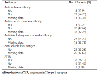 In our patient cohort, the presence of anti-AT1R antibody, antinuclear antibody, or anti-smooth muscle antibody posttransplant was not significantly associated with portal, central, sinusoidal, or overall fibrosis score.