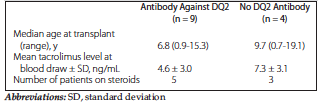 HLA-DQB1*02 has been reported to carry a higher risk for development of multiple sclerosis19 and confer a high risk for the development of celiac disease.20 However, almost no patients with celiac disease carry either one or more of the at-risk variants, and most individuals carrying the celiac disease-associated HLA-DQ molecules will never develop celiac disease, suggesting certain HLA genes are necessary but not sufficient for the development of celiac disease.20 In the same manner, because our study was a retrospective study, it was unclear what role factors such as medication nonadherence, degree of immunosuppression, and age at transplant played in predisposing recipients who developed antibody to HLA-DQB1*02 to developing ACR. As shown in Table 5, our numbers were much too small for meaningful statistics to be done; however, this should be further studied in a prospective fashion in a larger multicenter study.