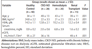 Table 1 compares the clinical data among the study subgroups. Post hoc analyses showed that age in the healthy control group was different (P < .001) versus the CKD-ND group but similar to age in the hemodialysis and renal transplant groups (P = .91). Participants in the healthy control and transplant group had similar body mass index (BMI) (P = .83) and percent hemoglobin (P = .37), with differences in these parameters from the other groups. Serum creatinine levels were lower in the transplant group, corresponding to high estimated glomerular filtration rate.