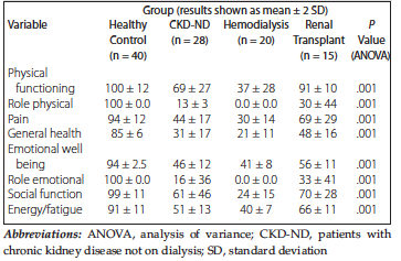 Conclusions: Quality of life is poor in patients with chronic kidney disease. However, renal transplant can improve quality of life. Transplant patients showed many quality of life scores similar to healthy individuals.