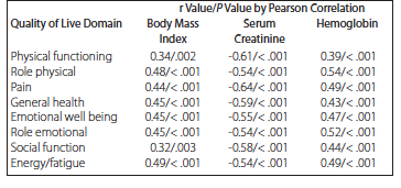 Associations among QoL domains were investigated versus selected clinical variables. Strong positive correlations of all QoL parameters were shown versus BMI and hemoglobin, and negative correlation were shown with serum creatinine levels (Table 3).