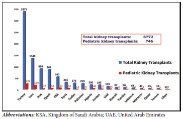 Results: In the single recent year, 8772 kidney transplants were performed for adult and pediatric patients in Middle East countries, making a total kidney transplant rate per million populations per year of 10.9 (ranging from 1.2 in Yemen and Pakistan to 39.7 in Turkey). Of these, 1399 transplants were from deceased donors (rate of deceased donor kidney transplants of 15.9%, ranging from 0% in 10 countries to 64.2% in Iran). Of 8772 total kidney transplants, 746 were pediatric recipients (<18 years old), with 166 pediatric kidney transplants from deceased donors (percent of deceased donor pediatric kidney transplant of 22.2%, ranging from 0% in 11 countries to 100% in Tunisia). Average pediatric kidney transplant rate per million populations per year was 0.93 (ranging from <0.1 in Pakistan to 3.2 in Syria). Average pediatric kidney transplant share was about 8.5% of total kidney transplants (ranging from 3.2 in Iraq to 20% in Algeria). The deceased kidney transplant program is currently available in only 8 of the 18 Middle Eastern countries included in this study. However, a deceased program is active in some Middle East countries (ie, Iran, Turkey, Kingdom of Saudi Arabia, Kuwait, and United Arab Emirates). Of note, Turkey had the highest kidney transplant rate per million populations per year (39.7), Syria had the highest pediatric kidney transplant rate per million populations per year (3.2), and Iran had the highest deceased donor kidney transplant percent of the total kidney transplants (64.2%). In the Middle East, Iran alone performed 63.5% (888/1399) of all deceased donor kidney transplants and 63.9% (106/166) of all deceased donor pediatric kidney transplants. Algeria had the highest pediatric kidney transplant share of the total transplants (20%). Low health spending, poorly developed infrastructures, delayed referral of children with chronic kidney disease, comorbidities, lack of technical expertise, inadequate pediatric dialysis programs, extended dialysis time, organ shortage, commercial transplantation, and posttransplant infections are the main pre- and posttransplant challenges. The community-government partnership model from the Sindh Institute of Urology and Transplantation in Karachi Pakistan showed that pediatric renal replacement therapy and transplant can be successfully established in a developing country.