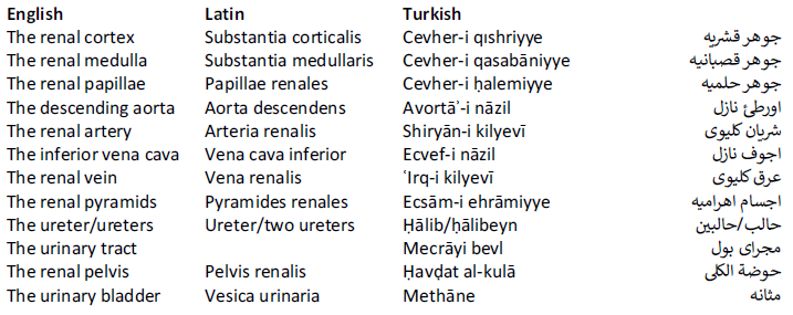Results: In the first book, kidney anatomy is discussed under the heading “fī teshrīḥ al-kulā” and bladder anatomy under “fī teshrīḥ al-methāne.” In the second book, the formation and excretion of urine are explained in different headings. In the third book, kidney inflammation and its treatment are discussed, with kidney and bladder stones and their medical treatments explained in detail. Finally, the types and treatments of urinary retention are discussed, with types, causes, symptoms, prognosis, and surgical treatments of bladder stones written in detail.