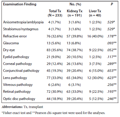 In this study, we reported that 80.3% of the patients had at least 1 pathological ocular finding. Previous studies in the literature have also reported high rates of ocular findings in transplant patients. The most commonly investigated solid-organ transplant in the literature is renal transplant; ocular findings after renal transplant have been reported to range from 52% to 89% in previous studies.1,4,7-9
