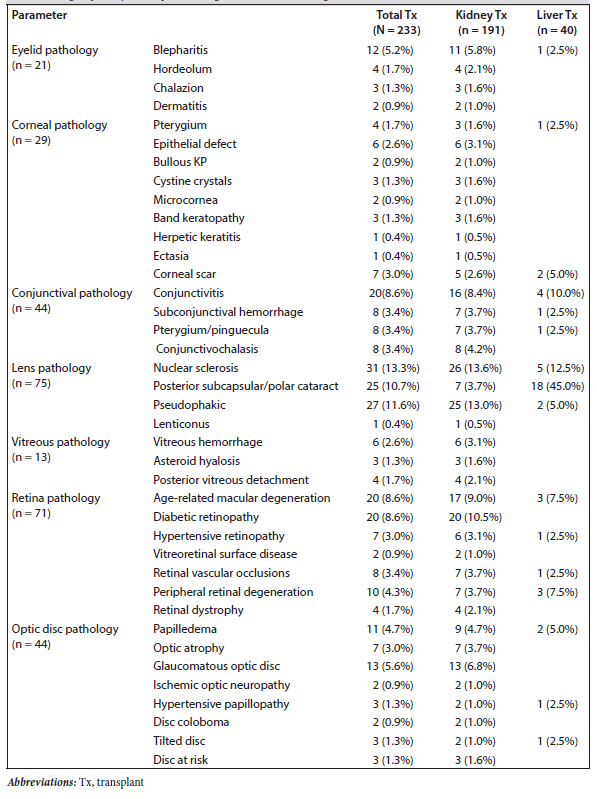 Results: Our study included 233 patients (191 kidney, 40 liver, 2 heart transplant patients). Mean age of patients was 42.94 ± 17.45 years. Among the patient group, 80.3% had at least 1 pathological ocular finding. In subgroup analysis, 12.4% of the patients had corneal pathologies, 19.3% had conjunctival pathologies, 33.0% had lens pathologies, 33.5% had vitreoretinal pathologies, and 18.9% had optic disc-related pathologies. The most common finding was dry eye, followed by cataract and vitreoretinal pathologies. The most common vitreoretinal pathology was diabetic retinopathy, followed by hypertensive retinopathy. The ocular pathology incidence in kidney and liver transplant patients was similar (P = .05). The 2 heart transplant patients did not have any ocular pathologies except refractive errors. In addition, no significant correlation was observed between posttransplant duration and ocular pathologies (P = .28).