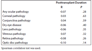 We also evaluated the correlation between the ocular pathologies and posttransplant disease duration. No significant correlation was observed (Table 7).