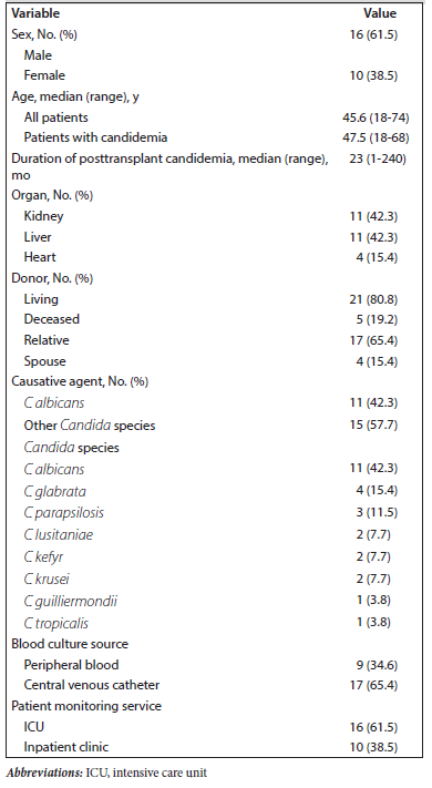 The mean age at transplant was 45.6 years. The median age was 47.5 years (minimum 18 years, maximum 68 years) among patients with candidemia. The rate of living donors was 80.1%. There were 16 male and 10 female patients (Table 1). The duration of posttransplant candidemia was 23 months (range, 1-240 months). The total frequency of Candida species that were C nonalbicans (57.7%) was higher in patients with candidemia. The most common agents were C albicans (42.3%) and C glabrata (15.4%). There were 17 (65.4%) catheter-related bloodstream infections in patients with candidemia. There were 16 patients treated in the ICU (Table 1).