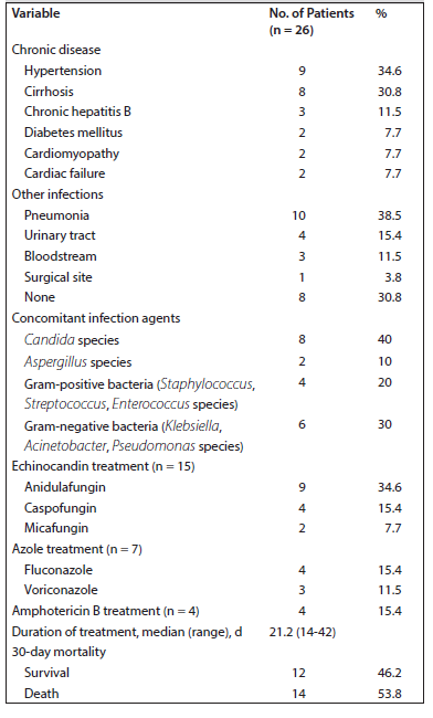 Echinocandins were used as treatment agents in 15 patients. Azole treatment was started in 7 patients, and amphotericin B treatment was started in 4 patients. The mean duration of antifungal treatment was 21.2 days (range, 14-42 days). Five patients died within 7 days, and 14 patients (53.8%) died within 30 days (Table 2).