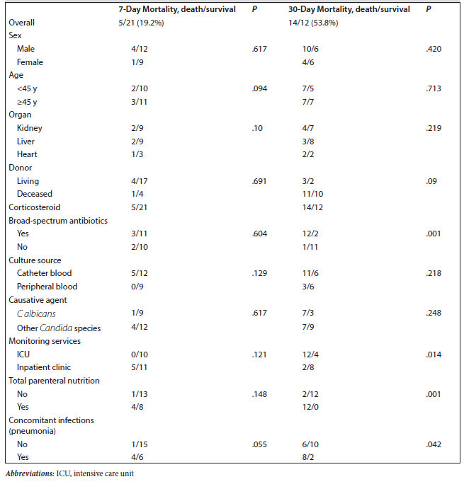 When risk factors and mortality were investigated, no significant difference was found in factors such as age, sex, organ type, donor, and Candida agent (P > .05). Thirty-day mortality was found to be significantly higher in patients followed in the ICU (P = .014), receiving TPN (P = .001), using broad-spectrum antibiotics (P = .001), and having pneumonia (P = .042) accompanying candidemia (Table 3). No significant difference was found between risk factors in the investigation of 7-day mortality.
