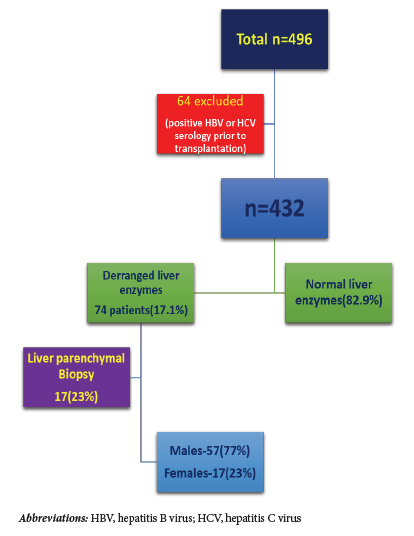 Results: All recipients of living related renal transplants from January 2015 to December 2016 were included in the study (n = 496). We excluded 64 patients with positive serology for hepatitis B or hepatitis C before transplant. Of the remaining 432 patients, 74 (17.1%) had deranged liver enzymes. Forty-one patients (55.4%) had deranged liver enzymes 3 to 4 years after transplant, whereas 23 patients (31.1%) had deranged liver enzymes 4 years after transplant. Liver parenchymal biopsy was performed in 17 patients (23%) to evaluate the etiology. The most common cause of deranged liver enzymes was sepsis, which was seen in 21 patients (28.4%), followed by viral hepatitis, ie, cytomegalovirus hepatitis in 7 (9.5%) and hepatitis C in 6 (8.1%) patients. Other causes included antituberculosis treatment-induced liver injury, autoimmune hepatitis, sinusoidal obstruction syndrome, and nonalcoholic steatohepatitis, observed in 4 patients each (5.4%).