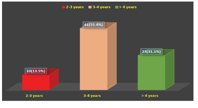 All patients who received a living related renal transplant from January 2015 to December 2016 were included in the study (n = 496). Sixty-four patients were excluded because of positive serology for HBV for HCV or history of deranged liver enzymes before transplant or deranged liver enzymes within 2 years after transplant. Of the remaining 432 patients, 74 (17.1%) were found to have deranged liver enzymes. There were 57 (77%) male patients and 17 (23%) female patients (Figure 1). In patients who developed deranged liver enzymes, all were receiving oral prednisolone as an immunosuppression therapy followed by azathioprine in 46 patients (62.2%), tacrolimus in 11 (14.9%), mycophenolate mofetil in 9 (12.2%), and cyclosporine and sirolimus in 1 patient (1.4%) patient (Figure 2). Forty-one patients (55.4%) had deranged liver enzymes 3 to 4 years after transplant, whereas 23 patients (31.1%) had deranged liver enzymes 4 years after transplant (Figure 3).
