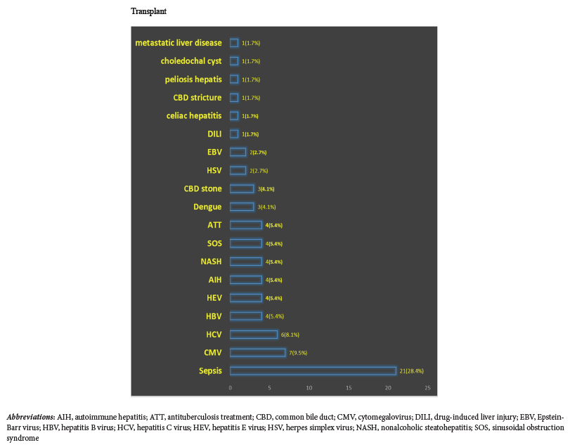 The cholestatic or obstructive pattern was the most commonly observed pattern of abnormal liver enzymes noted in 31 patients (41.9%), followed by hepatocellular and mixed pattern in 30 (40.5%) and 13 patients (17.6%), respectively (Figure 4). Liver parenchymal biopsy was performed in 17 patients (23%) to evaluate the etiology. The most common cause of deranged liver enzymes was sepsis, which was seen in 21 patients (28.4%), followed by viral hepatitis, ie, cytomegalovirus (CMV) hepatitis in 7 patients (9.5%) and HCV hepatitis in 6 patients (8.1%). Other causes included antituberculosis treatment-induced liver injury, autoimmune hepatitis, sinusoidal obstruction syndrome, and nonalcoholic steatohepatitis observed in 4 patients (5.4%) each (Figure 5). The baseline characteristics showed a mean age of 41.7 ± 9.46 years, total bilirubin of 2 ± 1.6 mg/dL, direct bilirubin of 1.2 ± 1.3 mg/dL, alanine aminotransferase of 111.9 ± 107.9 IU, aspartate aminotransferase of 99.5 ± 88 IU, alkaline phosphatase of 157.8 ± 111.2 IU, and γ-glutamyl transferase of 196 ± 227 IU (Table 1).