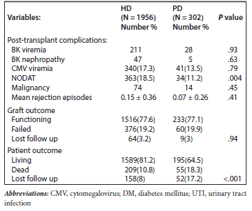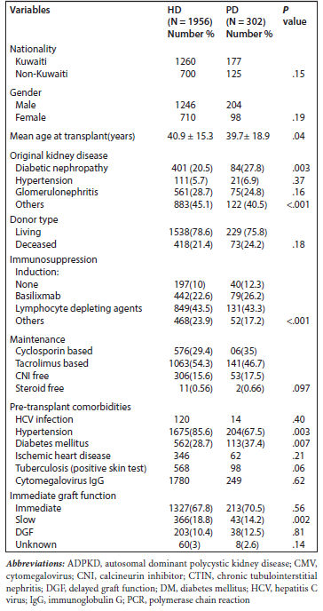 Materials and Methods: Two thousand two hundred fifty-eight kidney recipients following up in Hamed Alessa Organ transplant center in Kuwait were included and divided into two groups according to pre-transplant dialysis modality: Group 1: those who received hemodialysis (HD) and group 2: those with peritoneal dialysis (PD). Demographics, pretransplant and posttransplant comorbidities, and patient and graft outcomes were studied.