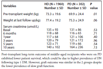 Post-transplant long-term outcome of middle-aged recipients who were on PD exhibited lower patient survival, which could be due to higher prevalence of DN following type 1 DM. However, graft outcome was similar in the 2 groups despite the lower prevalence of slow graft function.