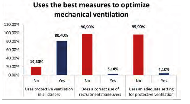 Among survey participants, a big deficiency was shown in ventilation strategies. Only 4.1% of participants correctly used all of the settings for protective ventilation and had correct use of recruitment maneuvers, suggesting this deficiency could lead to loss of lungs for transplant.