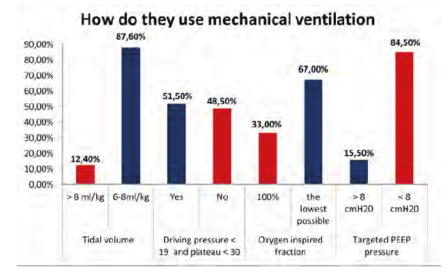 We analyzed 3 factors with regard to management of mechanical ventilation: the use of protective ventilation, the correct use of recruitment maneuvers, and the setting of the variables from protective ventilation. Among those surveyed, 80.4% reported using protective ventilation, but only 4.1% used it adequately (Figure 1). Recruitment maneuvers were routinely used by 3.1% of those surveyed.13,14
