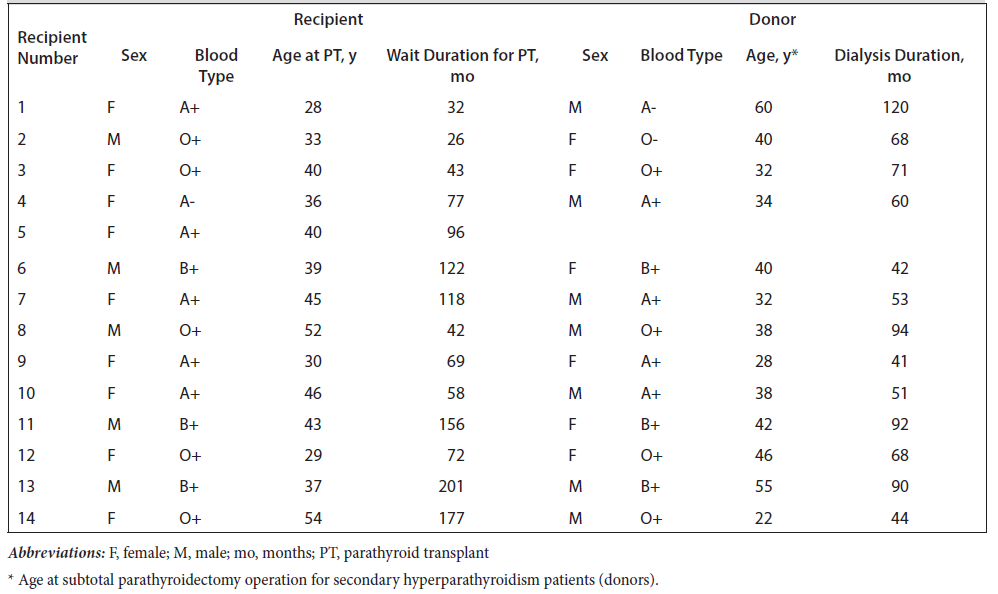 We evaluated 14 PT recipients from 13 donors. Each donor had parathyroid hyperplasia secondary to chronic kidney failure and was transferred to the general surgery department from the nephrology clinic. All donors used calcimimetics as part of their hyperparathyroidism treatment process. However, they reported that they could not take prescribed calcimimetics on a regular basis due to their side effects. After written informed consent was received, donors were screened for viral markers, including anti-HIV, anti-hepatitis C virus HCV, anti-HBc, anti-HBs, and anti-HBe antibodies, hepatitis B virus antigen, cytomegalovirus immunoglobulin G (IgG) and IgM antibodies, Epstein-Barr virus IgG and IgM, and venereal disease research laboratory tests. Patients then underwent subtotal parathyroidectomy and were discharged after 3 days without any complications. Epidemiological features for each recipient and donor are summarized in Table 1.