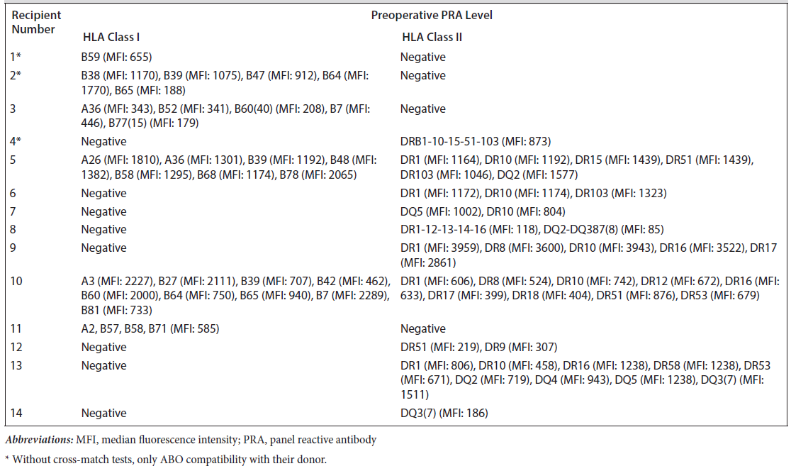Among 14 patients, 2 showed both HLA class I and II PRA positivity. In recipient 10, MFI values were below 900 for HLA class II. After PT, the recipient’s healing process was consistent with patients in the HLA class I PRA-positive group; her HLA class I positivity was between 462 and 2289.