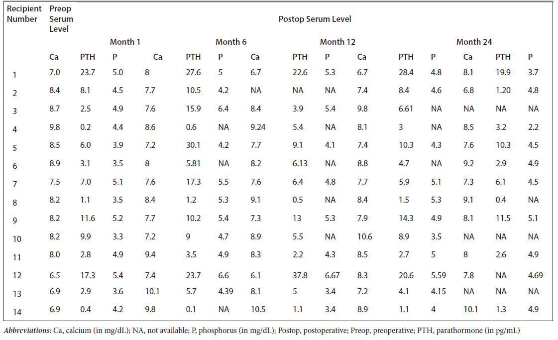 Table 4.Serum Calcium, Parathormone, and Phosphorus Levels of 14 Parathyroid Transplant Recipients During 24-Month Follow-Up