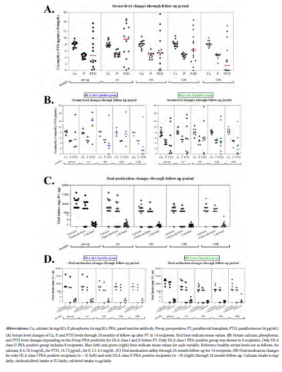 Results: Preoperative panel reactive antibody positivity was assessed in 3 groups. The HLA class I-positive group (mean fluorescence intensity range, 179-1770) showed decreased medication use and stability in serum calcium levels. The HLA class II-positive (mean fluorescence intensity range, 85-3959) showed decreased medication use by 25% to 50% and returned to their former prescription doses after 12 months. An opposite pattern was observed in 2 patients with panel reactive antibody positivity for both HLA classes (mean fluorescence intensity range, 462-2289), with 1 patient requiring medication for continuing symptoms and the other patient occasionally taking additional magnesium supplementation, despite decreased medication doses after 12 months. Serum calcium levels remained normal, and parathormone and phosphorus levels were elevated.