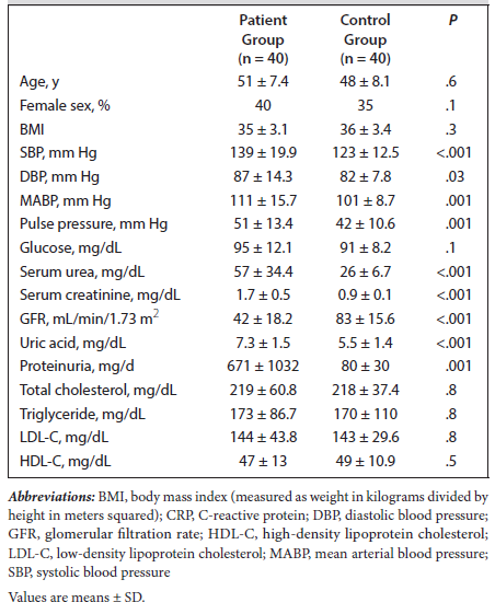 Results: Mean age of patients was 51 ± 7.5 years (range, 29-62 years), and 40% were female. Mean body mass index was 35 ± 3.1. Four patients (10%) had morbid obesity; 21 (52.5%) had hypertension. Glomerular filtration rate (42 ± 18 vs 83 ± 15 mL/ min/1.73 m2, respectively; P < .001) were significantly lower. However proteinuria (671 ± 1031 vs 80 ± 30 mg/d, respectively; P< .001) were significantly higher in patients than in controls. Also, serum kallistatin and arterial stiffness were significantly higher in patients (P < .05).’’The Pulse Wave Velocity was higher in patients with hypertension (P = .01); GFR was lower (P < .01); serum uric acid level was higher (P < .001); and neutrophil-to-lymphocyte ratio (P < .05), C-reactive protein level (P < .05), and serum kallistatin level were higher (P < .05).