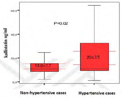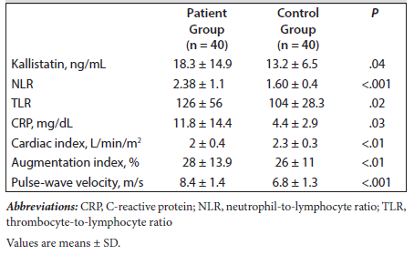 When the inflammation parameters and arterial stiffness parameters of the patients and the control group were compared, these parameters were statistically higher in the patients (P < .05) (Table 2). The comparison of kallistatin levels between the 2 groups is presented in Figure 1.