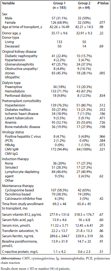 Our 2 groups had comparable demographics. Groups had comparable mean age, blood type, dialysis modality, and pretransplant comorbidities. Group 2 had greater prevalence of chronic glomerulonephritis, and group 2 had greater prevalence of diabetic nephropathy. Most patients were maintained on mycophenolate mofetil (94.1%) and cyclosporine (60.3%), and 32.4% of patients used tacrolimus (not significant between groups) (Table 1). Moreover, mean dose of antiproliferative agents was comparable between the 2 groups. In patients with hypertension, treatment with angiotensin-converting enzyme inhibitors or angiotensin II receptor blockers was comparable between the groups, with no difference in the number of antihypertensive medications.