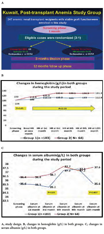 All patients were evaluated monthly in the outpatient clinic with history and medical examination and laboratory investigations that included hemoglobin, hemoglobin electrophoresis, iron-ferritin, TSAT, prothrombin time, vitamin B12, folic acid levels, parathormone, CRP, erythrocyte sedimentation rate, serum creatinine, creatinine clearance, liver function tests, calcium/phosphorous, fasting plasma sugar, urinary protein (g/24 h), immunosuppressive drug levels, and viral profile (cytomegalovirus, Epstein-Barr virus, parvovirus). Patients underwent QOL assessment with the Outcomes Study 36-Item Short-Form Health Survey questionnaire17 and Kidney Transplant Questionnaire-25 questionnaire.18 We analyzed changes between baseline and month 12.