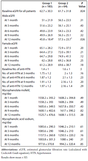 The mean number of biopsy-proven acute graft rejection episodes was comparable between groups (P > .05). Despite the comparable graft function at the start of the study (eGFR was 68.7 ± 30.3 and 67.7 ± 31.8 mL/min/1.73 m2 in group 1 and 2, respectively), men in group 2 had better graft function at 12 months (P < .05) (Table 1). At 1 year, the mean eGFR decreased by 22.9 versus 10.3 mL/min/1.73 m2 in men in group 1 and group 2, respectively (P < .001), but this decline was not significant among women in both groups.