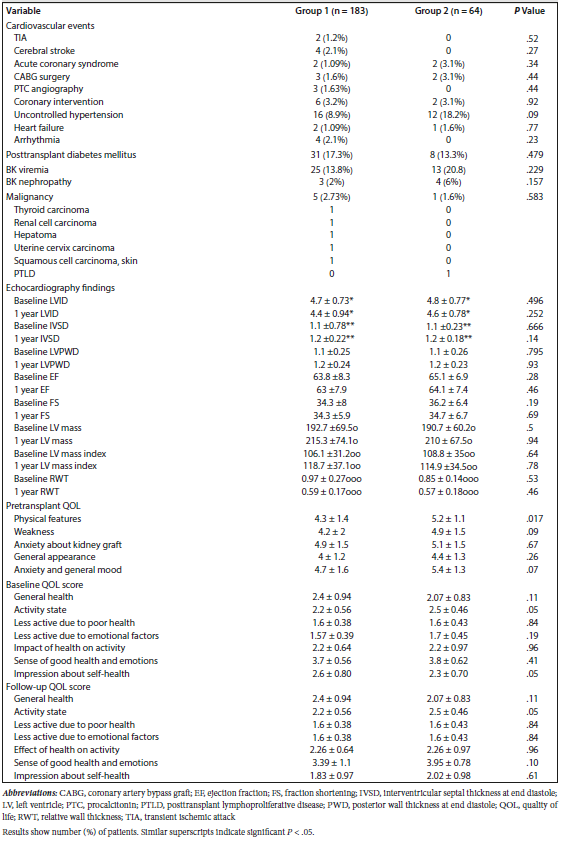 Results: The 2 groups were comparable regarding pretransplant characteristics. In group 2, we observed comparable posttransplant complications (P > .05) but better graft function at 6 months and better cardiac indexes at 1 year of the study (P < .05). At 12 months, quality of life had improved after full correction of posttransplant anemia in the renal transplant recipients who received erythropoietin-stimulating agents.