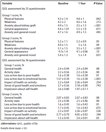 During follow-up, group 2 showed improved QOL for physical features, anxiety, general mood, and physical activity. However, posttransplant mean score percentage of physical features, weakness, anxiety about the future kidney graft, general appearance, and general mood were comparable in both groups (P > .05) (Table 4). Group 1 had higher posttransplant mean percent score of physical features and higher pretransplant percent score of anxiety about kidney graft (P = .042 and P < .001, respectively).