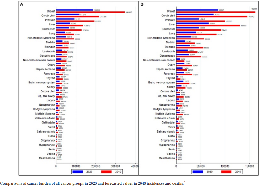 Africa. Figure 1 shows comparisons of cancer burden of all cancer groups in 2020 and forecasted values in 2040 incidence and deaths.2 Launay-Vacher and colleagues3 reported survival rates in patients with cancer according to baseline glomerular filtration rate at inclusion (n = 4267) and in nonmetastatic patients (n = 2382). Renal insufficiency, anticancer medications, and worse kidney function impair cancer survival.