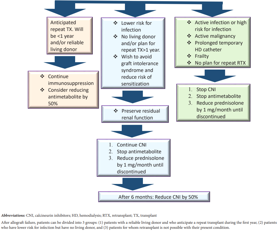The optimal immunosuppression strategy in patients with failed allografts should be balanced between the potential risks (eg, infection, malignancy, and cost) and benefits of continuing on immunosuppressive drugs (eg, avoiding sensitization, avoiding graft-intolerance syndrome, and protecting residual kidney function). A recent study from the Mayo Clinic has shown that kidney transplant recipients with allograft failure have a high mortality rate after initiation of dialysis. Although immunosuppression withdrawal was associated with increased calculated panel reactive antibody, it was not associated with lower incidence of retransplant (probably due to rigorous donor selection, such as paired donors and HLA matching by organ sharing). Therefore, if retransplant is delayed, then it is reasonable to discontinue immunosuppression after allograft failure despite sensitization.14