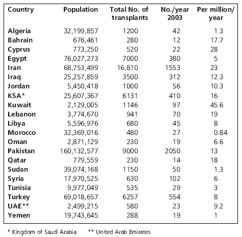 There is no real transplant program in Bahrain, Qatar, Yemen, and the UAE. Sporadic kidney transplants are performed every year locally. However, most of the transplants are performed outside the countries. In 2003, there were 12, 14, 19, and 23 kidney transplants in Bahrain, Qatar, Yemen, and the UAE respectively. None of the UAE transplants were performed in the country (Table 1).