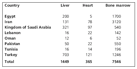 Through the end of 2003, 155 cadaveric and 350 living-related kidney transplants were performed in Tunisia [3]. Only 30 kidney transplants were performed outside the country (Table 1). There is also a modest multiorgan transplant program that has performed 16 liver, 14 heart, and 196 bone marrow transplants (Table 2).